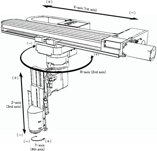 The figure below shows the names of the components of the robot unit and the motion direction of each axis.