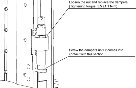 Replace the two dampers on the 3rd axis (Z-axis) during the annual inspection. The replacement interval is 2,000,000 cycles of the 3rd axis reciprocating motion. However, deterioration may accelerate with extremely quick operation, with prolonged operation, or under the special environment. In such cases, conduct tests below, and use the test results as an indication.
