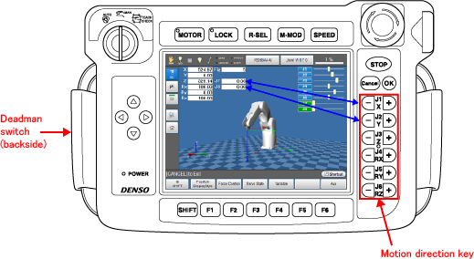 By the aid of the deadman switch linkage function, this can set the motor power ON/OFF by pressing/releasing the deadman switch respectively. Turning on the [Motion direction key] displays a key to indicate the motion direction on the right side of the screen when the deadman switch is gripped.