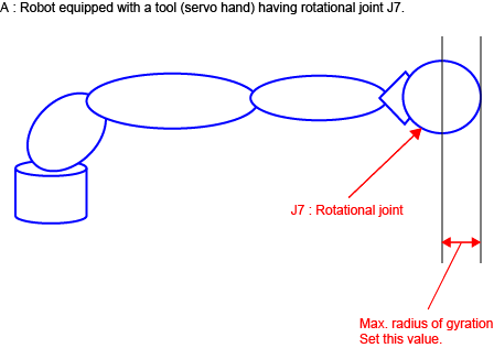 - When the robot is equipped with a tool (e.g., servo hand) having rotational joint J7 as shown in figure A, specify the radius of gyration of the rotational joint as a parameter.