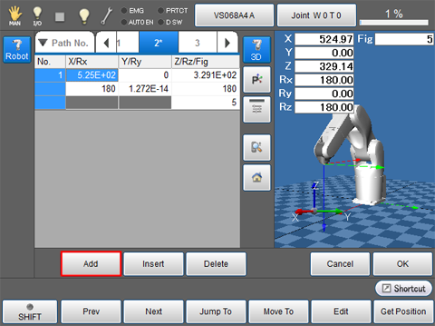 Move the robot until the target position, then press [Add] to retrieve the current position.