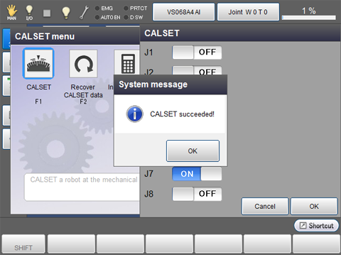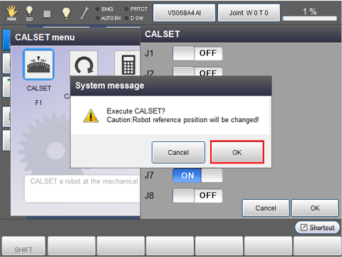 Select the extended-joint to perform CALSET and then press [OK]. The indicator of the selected button turns into "ON".