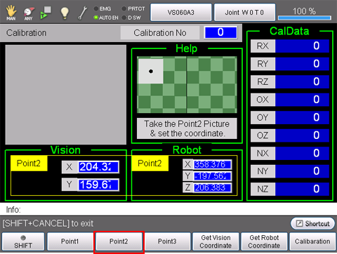 Pressing the [Point 2] button enables registering the vision coordinates and robot coordinates of the second point.