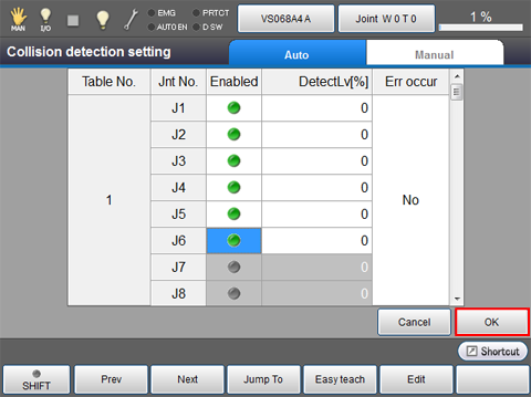 Select the axis numbers for which to enable the collision detection function and press [Enable] or [F5 Edit] for each axis number.
