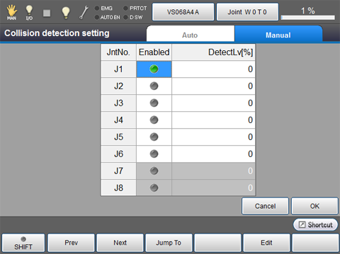 From the top screen, select [F2 Arm] - [F6 Auxiliary function] - [F2 Collision Detection] - [Manual] tab.