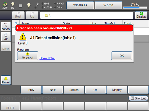 A warning is displayed for the axis where a collision has been detected. Pressing [OK] can clear the warning.