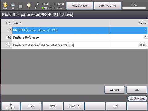 From the top screen—[F4 I/O]—[F6 Aux.]-[F4 Field Bus parameter]