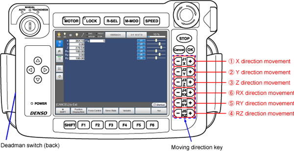 Press moving direction keys as required while pressing the deadman switch to move robot to the position to be set as P1.