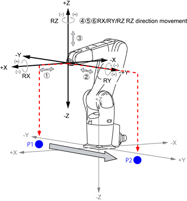 Press moving direction keys as required while pressing the deadman switch to move robot to the position to be set as P2.