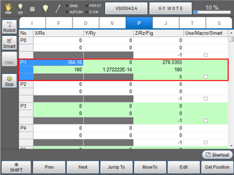 The current position is loaded as variable P1. Coordinate system information is written in Usage (Use/Macro/Smart) cell.