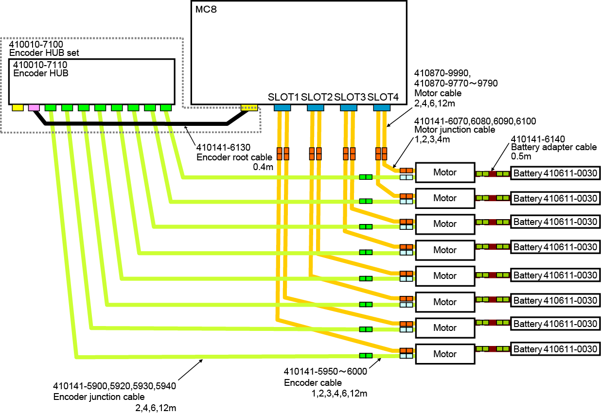 - The total length of an encoder cable for each axis between a connection port of the encoder HUB and a connection port of the motor shall be 16meter or less. The total length of a motor cable of each axis between a connection port of the controller and a connection port of the motor shall be 16meter or less. The total length of all axes is 96m at the maximum.