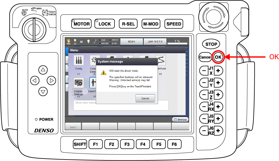 Once the icon of the teach pendant is displayed on the upper left of the screen, the direct mode starts.