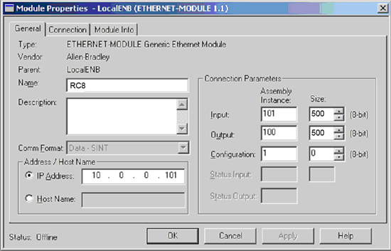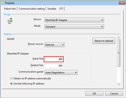Connecting the PLC manufactured by Rockwell Automation and the RC8 controller through EtherNet/IP may require special settings. If the RC8 cannot connect with the PLC, try the setting shown below.