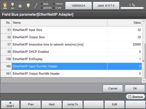 Select [160:EtherNet/IP Input Run/Idle Header] then press [Edit].