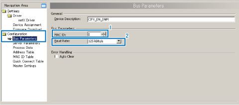 | 2 | Baud Rate | Select the communication speed of DeviceNet from 125Kbps, 250Kbps and 500Kbps |