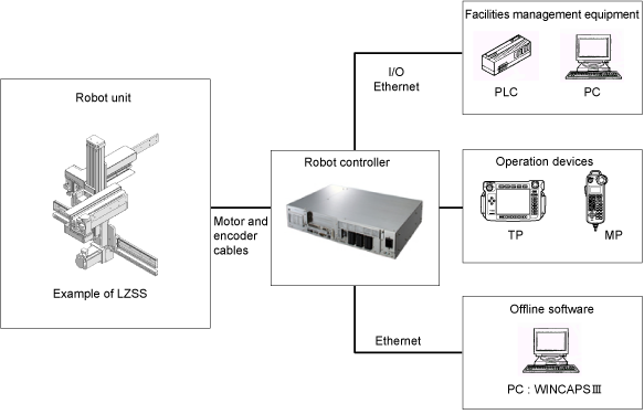 The controller controls the motion of the robot unit according to programs built with signals sent from the connected facilities management equipment. When an operation device is connected, it allows the customer to manually operate the robot unit or make various settings.