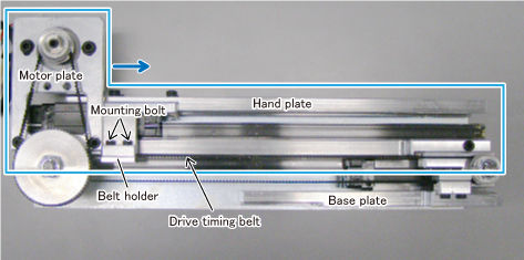 Loosen the two mounting bolts on the hand plate so that the joint position of the drive timing belt and the belt holder can be adjusted.