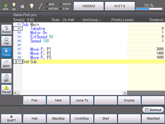 You can monitor the trace log by pressing [trace] button on the left side of the programming window when the auto mode or the teach check mode is selected.