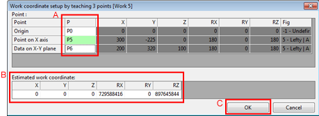 Once a work coordinate is calculated from Point, the result will be displayed in the text boxes, and then [OK] button will be enabled.