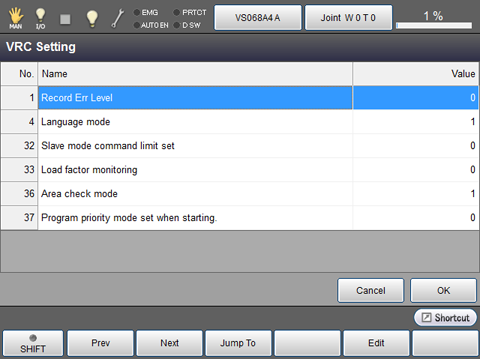 | [F5 Edit] | Select a parameter that you want to change, and then press [F5 Edit]. Once a dialog box is displayed, select a desired item, and then press [OK] on the dialog box. The changed value is confirmed by pressing [OK] on the [VRC Setting] window. |