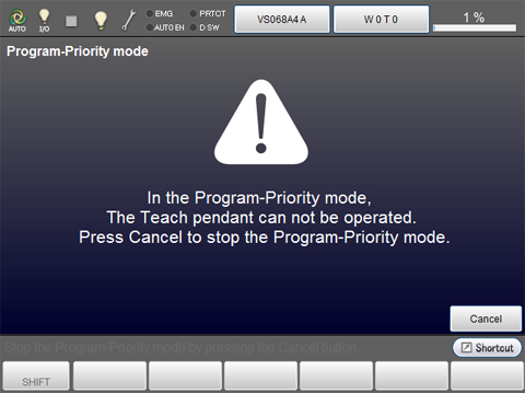 Available keys and a button under the program priority mode are Emergency stop, STOP, Cancel, MOTOR, LOCK keys, and the Cancel button on the teach pendant screen.