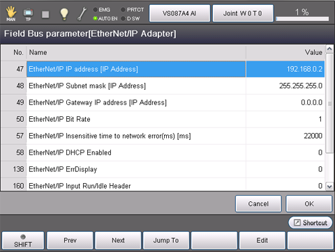 From the top screen—[F4 I/O]—[F6 Aux.]-[F4 Field Bus parameter]