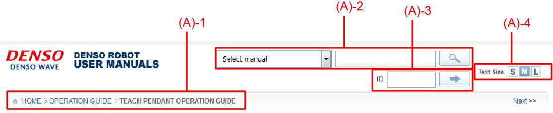 | (A) Header area | You may switch to upper contents, search key words or switch character sizes. |