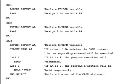 When three programs (PRO1 through PRO3) exist in the same folder:Execution of PRO3 after that of PRO1 terminates the program (STOP).Execution of PRO3 after that of PRO2 temporarily halts the program (HOLD "STOP").Variable AA declared in the three programs will have the same value.
