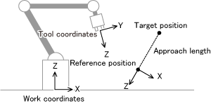 The system moves to a position away from the reference position for a holding position, etc. by the approach length. A point away from the reference position by the approach length in direction toward the "tool's -Z coordinate" for the reference position.