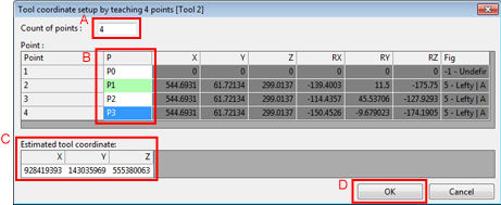 Once a tool coordinate is calculated from Point, the result will be displayed in the text boxes, and then [OK] button will be enabled.