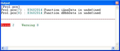 An error triggers an error message consisting of an indication, error number, the line number, and a brief note in the Output window.