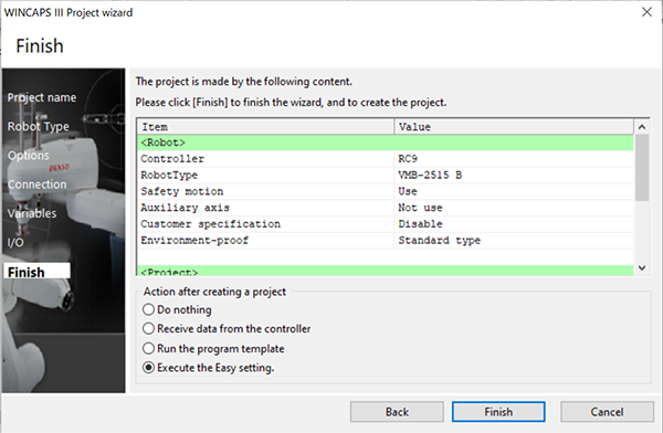 In the [Action after creating a project] pane, select [Execute the Easy setting] and then click [Finish].