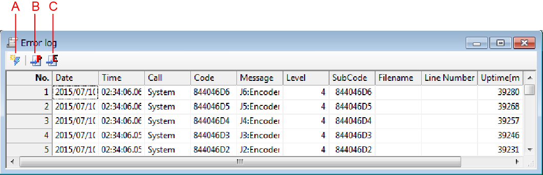 Error log records errors occurring in the controller. The most recent 1,000 errors are recorded. The data is saved in data storage memory.