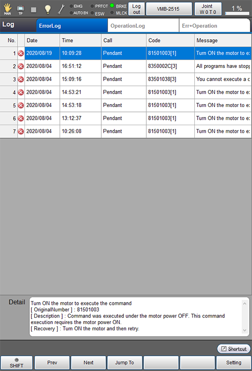 Pressing the cursor key on the Smart TP will move the cursor to the up and down so that you can check the log.