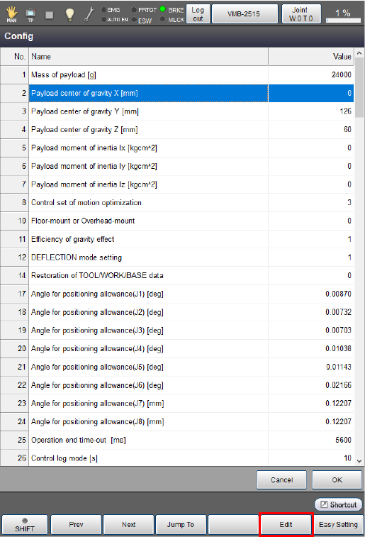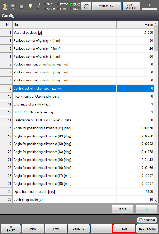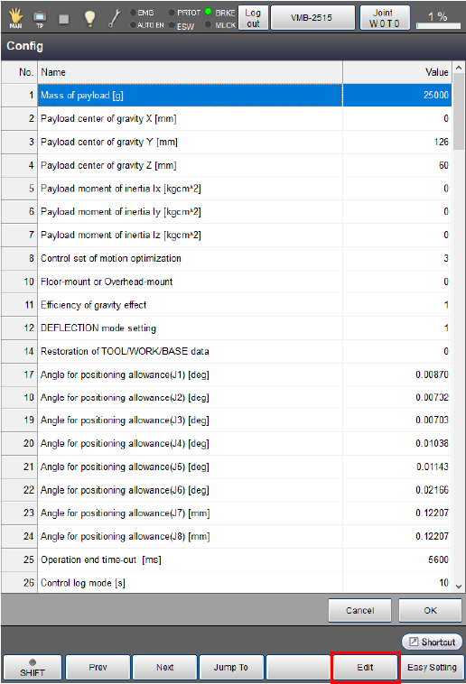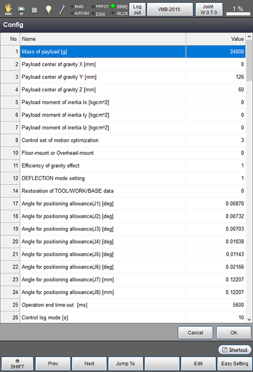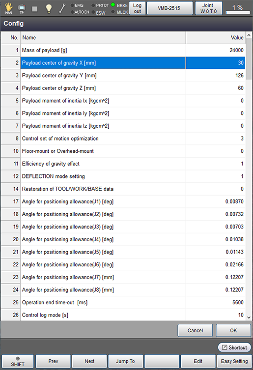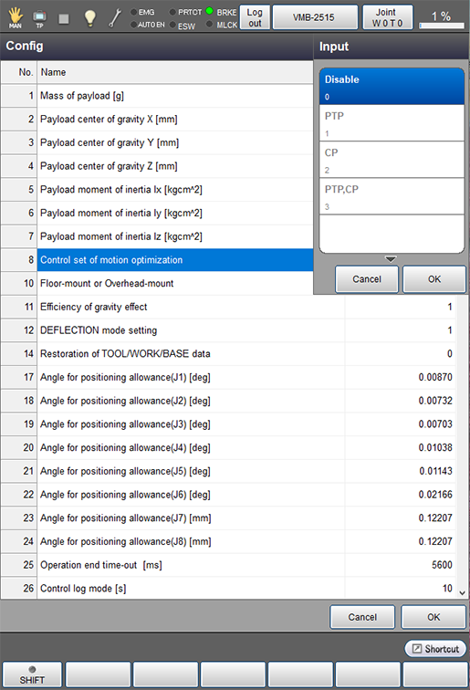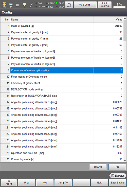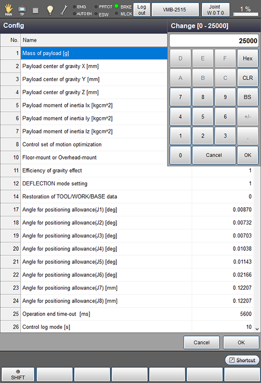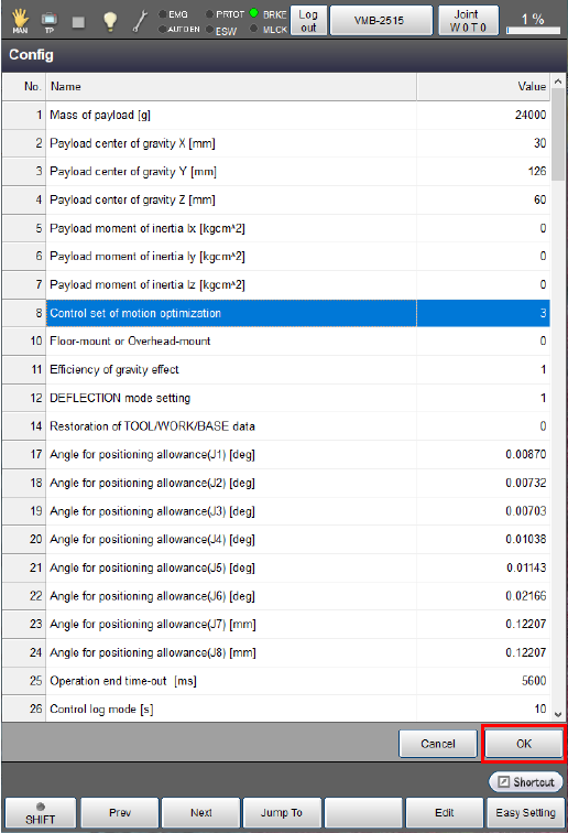 Set the basic parameters such as "mass of payload" of the tip of robot arm (total mass of tool and payload if too is used), "payload center of gravity", and "optimal speed control function" to set proper speed and acceleration of robot under these load conditions.
