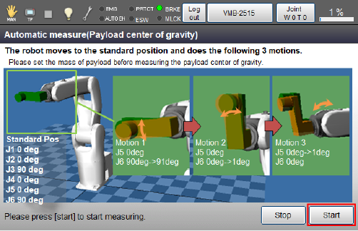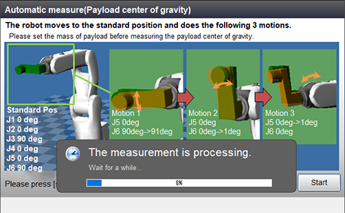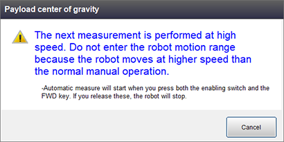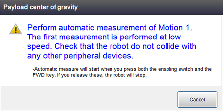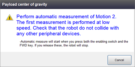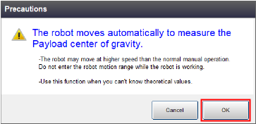 Information of how a robot performs and caution about measuring will be shown in the window of Payload center of gravity.
