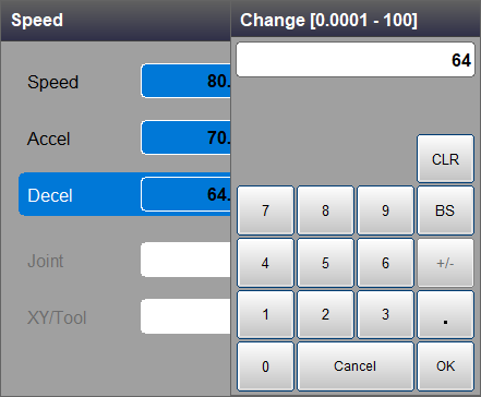 Numeric keypad is disappeared, and the deceleration is updated with the entered value as shown below. Press [OK] to confirm this value.