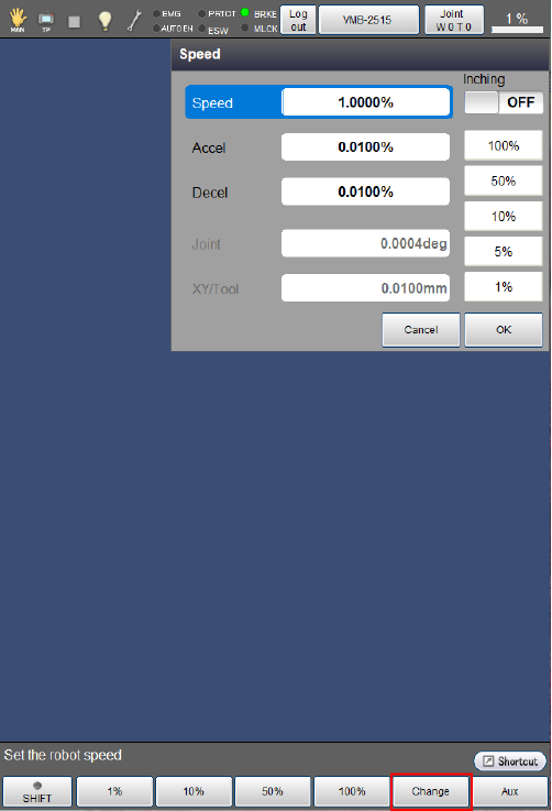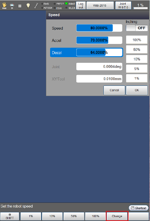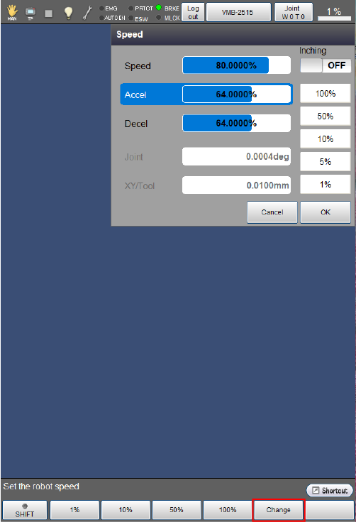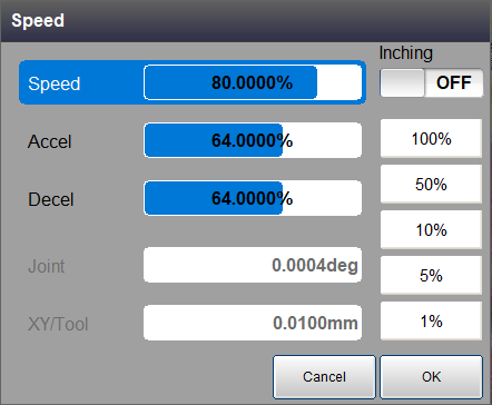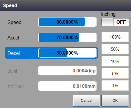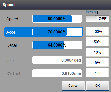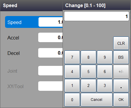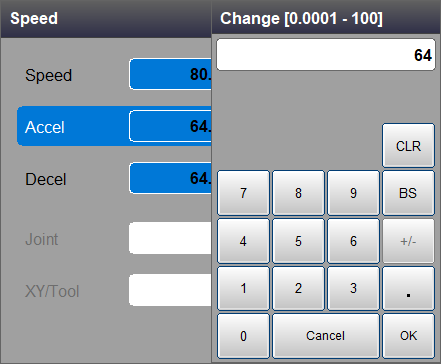 Numeric keypad is disappeared, and the acceleration is updated with the entered value as shown below. Press [Cancel] key to cancel updating. Screen will be back to normal. If [Cancel] is pressed here, then the updated external speed will be also back to the original state.
