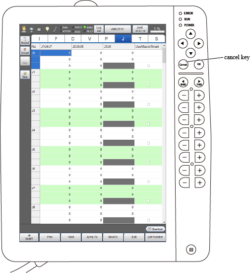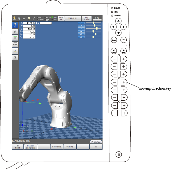 With keep pressing down the enabling switch, tap the motion direction keys to move the robot to the position to be set as P1.