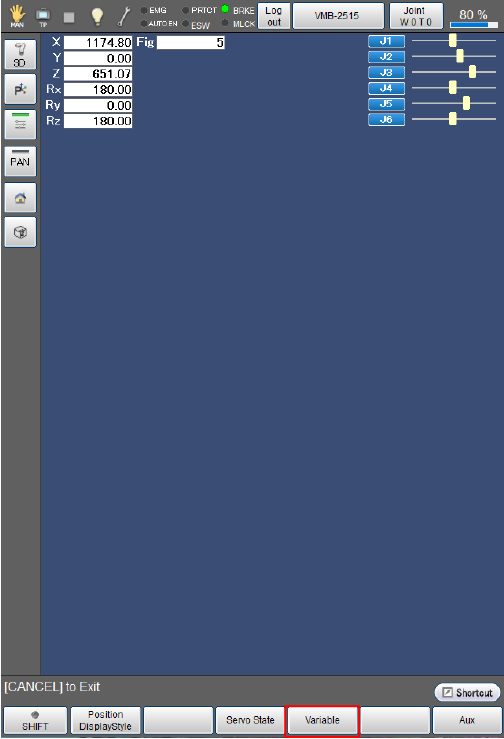Tap [F2 Arm] on the Smart TP to display information on each axis of the arm.