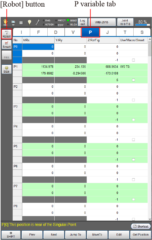 Save the current robot position to the variable name "P2" by the same procedure of P1 position saving.