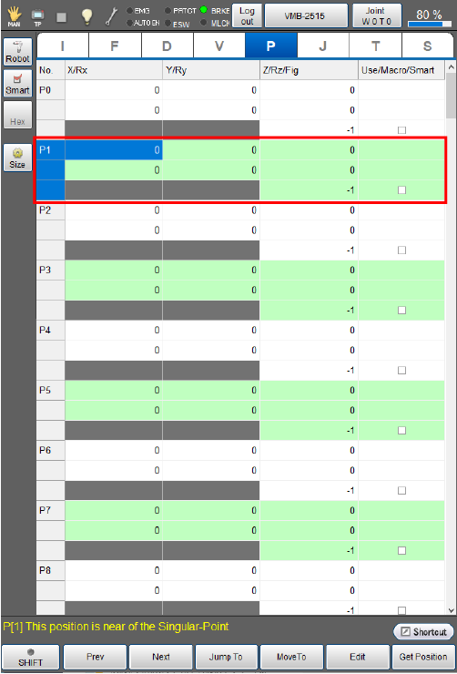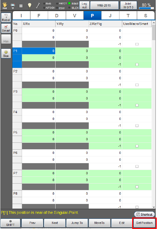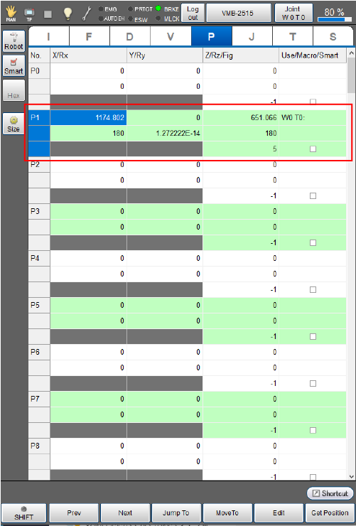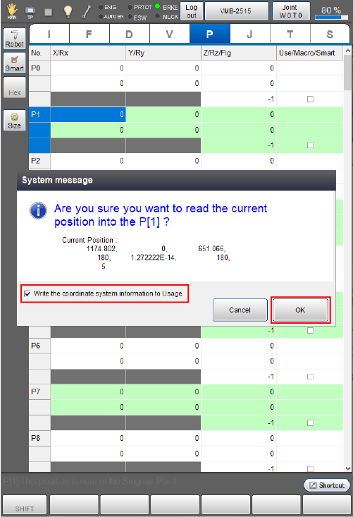 The current position is loaded as variable P1. Coordinate system information is written in Usage (Use/Macro/Smart) cell.