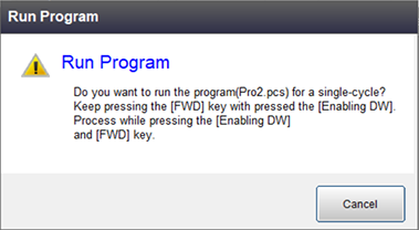 While the following message is displayed, with keep pressing down the enabling switch, tap the [OK] key. Keep pressing both the enabling switch and [OK] until the program execution completes.