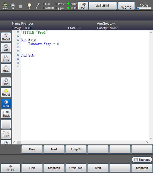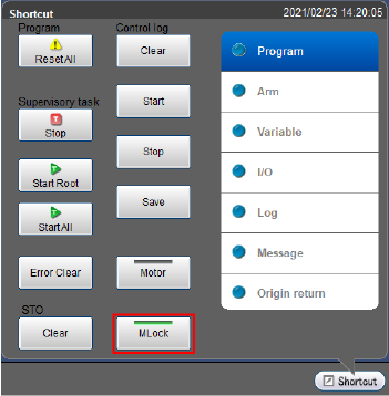 From the shortcut menu, tap the [MLock] button to set the robot in machine lock.
