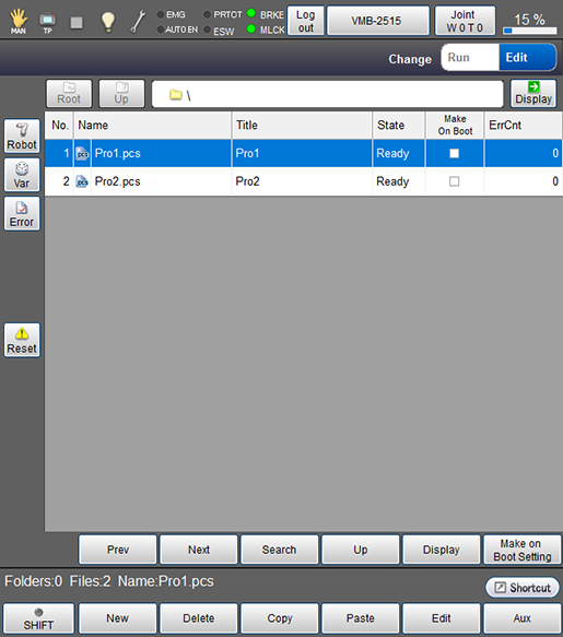 Display the screen to create new program. Enter program name, and press [OK] to display contents of new program. The pre-prepared sample programs including "Pick & Place" and "Palletizing" can also be used. New folders and new header files are also created in the screen to create new program. |