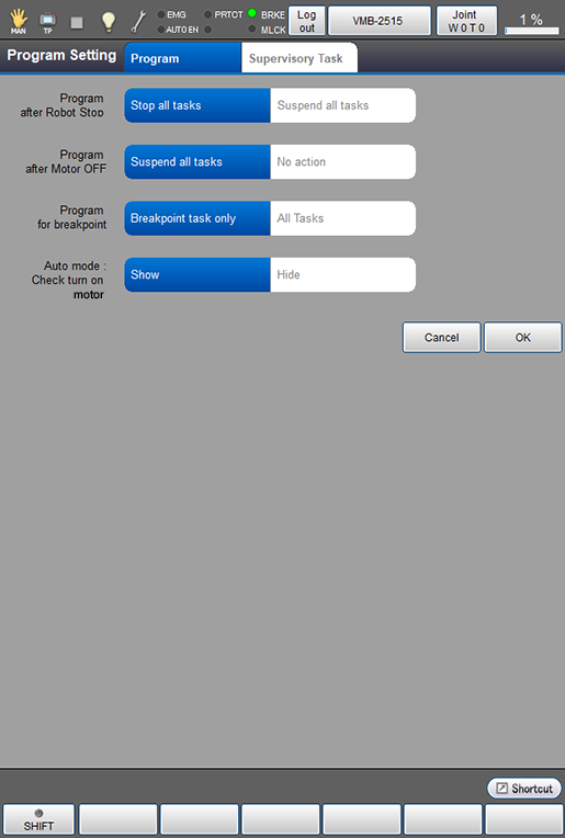 Set if the program should stop or not during emergency stop. Change settings by directly touching the screen. The selected section will be highlighted. |