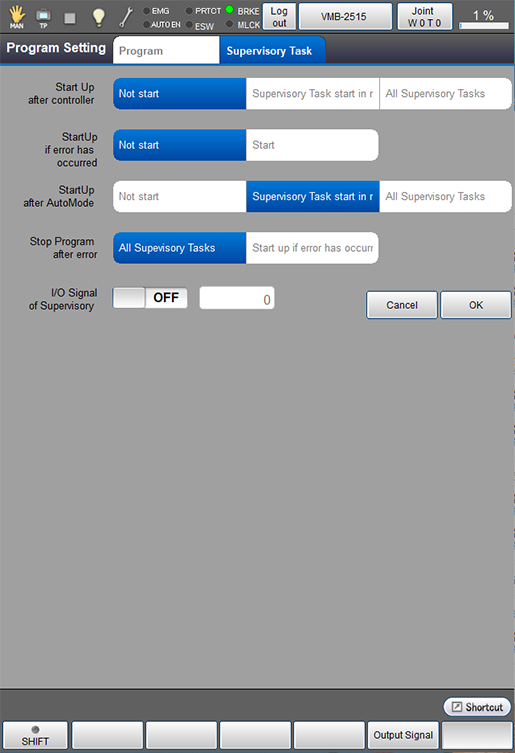 Press [F1 Program settings] to display [ProgramSetting] window. Then, select [SupervisorTask] tab to display the following supervisory task setting window.