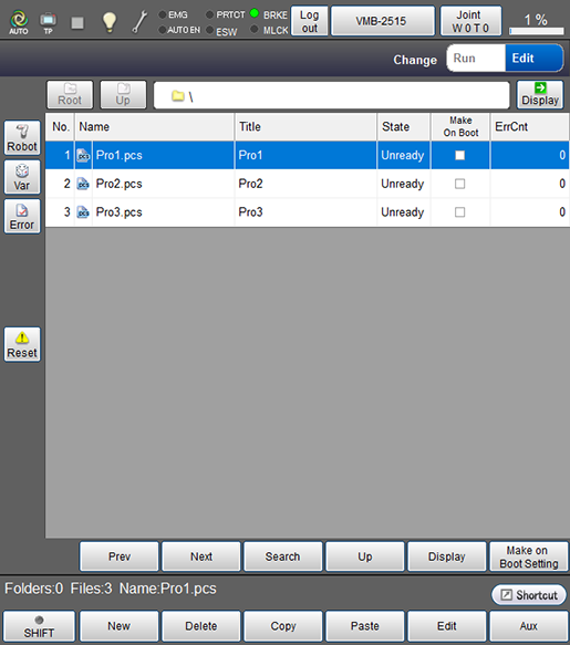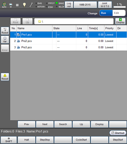 | [F1 New] (*1) | Display the screen to create new program. Enter program name, and press [OK] to display contents of new program. The pre-prepared sample programs including "Pick & Place" and "Palletizing" can be also selected and used. New folders and new header files are also created in the screen to create new program. |