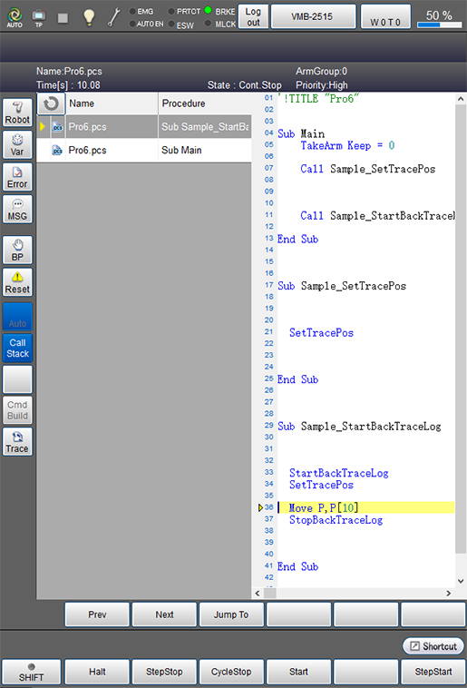 | Name | Display caller's file names (pcs, pns, or h file) in order. The lowest line is a first caller, and a file name indicated by an arrow is a currently running file.Touching a file name will display its source code on the right side.