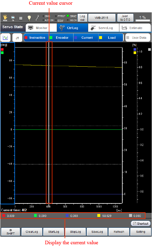 Acquire control logs of respective items including command position, encoder position, current position, and load factor of each axis and userdata (SysLog.Ctrl.UserData), and display the graph on the window of the smart TP.